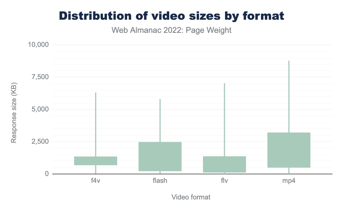 モバイルウェブのメディア章によると、モバイルページの5%にvideo要素が含まれています。この情報は、ビデオファイルがセットにグループ化されている全体的なページ重量の他のファイルタイプの100パーセンタイルと一致しています。ビデオ体験を提供するページは、それに応じて重量が増加します。
