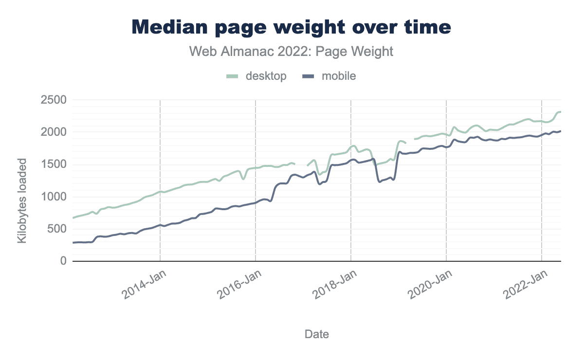2012年6月から2022年6月の10年間で、デスクトップページロードの中央値のページ重量は221%、または1.6 MB増加し、モバイルページロードでは594%、または1.7 MB増加しました。