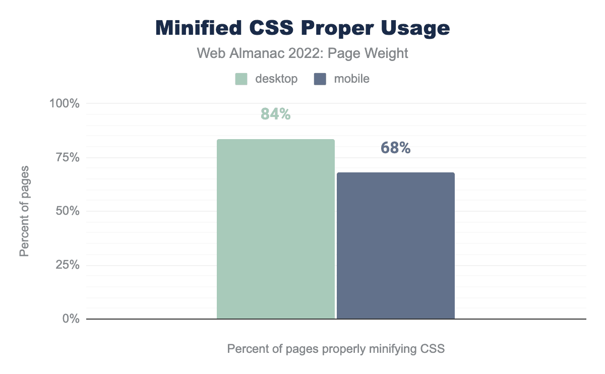 デスクトップページロードの84%が提供されたCSSを正しく縮小化し、モバイルページロードの68%がより少ない割合でした。