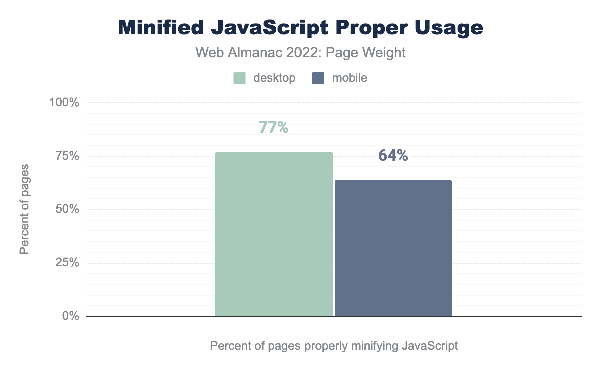 デスクトップページロードの77%が提供されたJavaScriptリソースを正しく縮小化し、モバイルページロードの64%がより少ない割合でした。