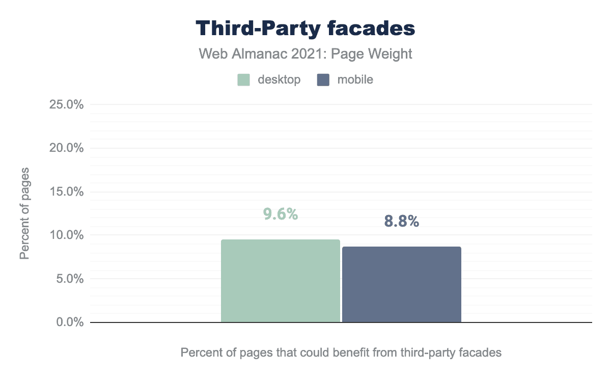テストされたデスクトップページの9.6%がファサードの実装から恩恵を受ける可能性があり、モバイル訪問ではやや良好な8.8%です。